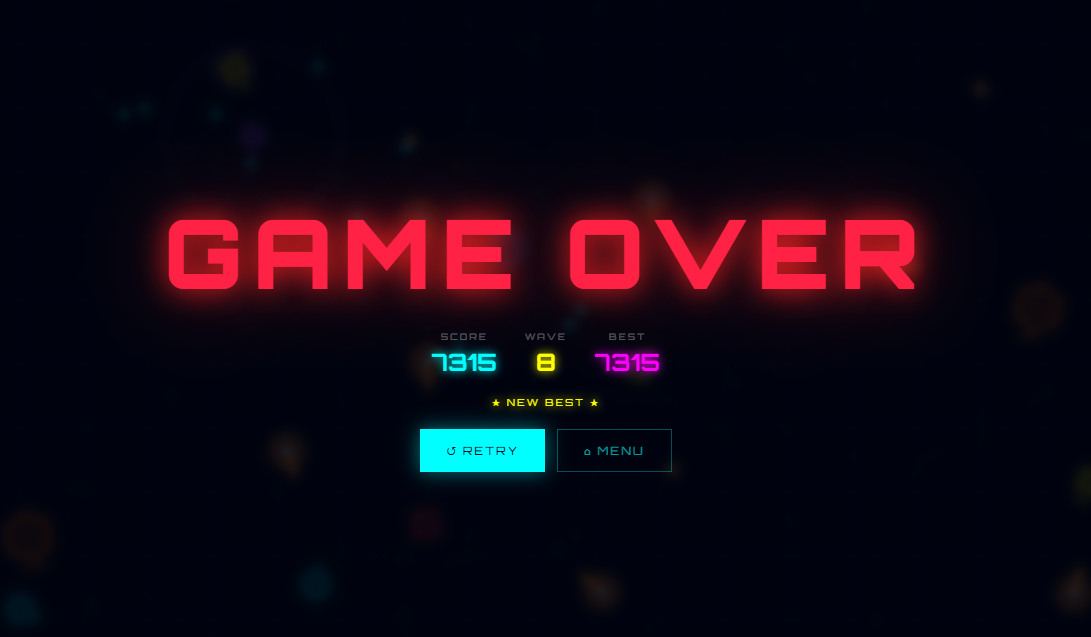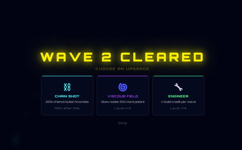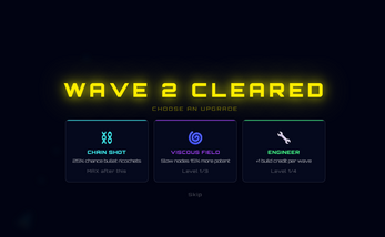 Neon Void is a fast-paced browser arcade shooter where you hold the line against endless waves of glowing enemies. Build barriers, drop turrets, and evolve your loadout between waves then face down three massive bosses that will test everything you've built. Survive long enough and the void never stops coming.